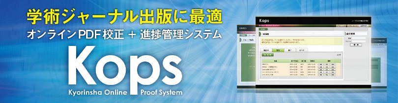 Kopsは「学術ジャーナル出版に特化したオンライン校正システム」で、学術ジャーナル出版のノウハウを熟知した杏林舍が仕様設計・デザイン・開発をしました。オンラインならではの「郵送コストの削減」、「進捗管理などを通じた、制作・出版工程の大幅なスピードアップ・合理化」が可能なのはもちろんですが、特に「著者校正」まわりに力を入れています。学術ジャーナル出版における著者校正のように、「1度きりしか校正システムを利用しない人」が不特定多数登場するようなシチュエーションでは、「著者一人ひとりへのアカウント発行」、「ツールの使用方法に関するサポート」などが障壁となり、オンライン校正を導入することは困難でした。しかしKopsでは、専用に用意されたわかりやすいナビゲーションツールがありますので、そのような著者の方々にもストレスなくご利用いただけます。
