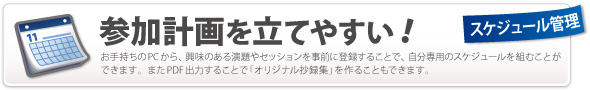 ユーザー登録後、タイトルや、抄録本文のキーワードから検索しながら興味のある演題を登録したり、タイムスケジュールを見て空いた時間を埋めていったりと大会中の自分の行動をシミュレーションします。