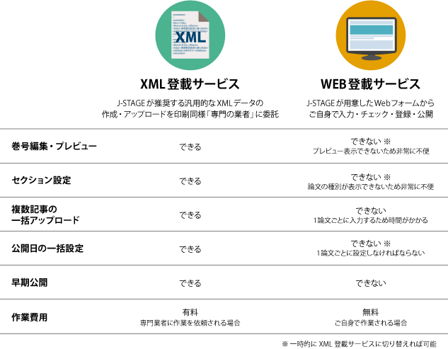 WEB登載サービスはご自身で行えばXMLの知識も要らず、無料で済むというメリットはありますが、1論文ごとに様々な項目を入力しなければならないのでかなり時間がかかることや、簡易的なシステムのため、上記の様々な機能がに制限があることや、入力・チェック・アップロード・公開までを全て自己責任で行うとなると決してハードルが低いとは言えません。印刷同様に専門業者に頼めば、プロ仕様の仕事がなされることや、汎用的に使える仕様のXMLデータを納品してもらい学協会の資産として保存していくことも可能です。